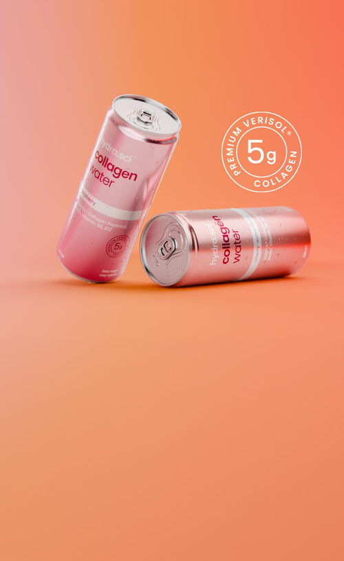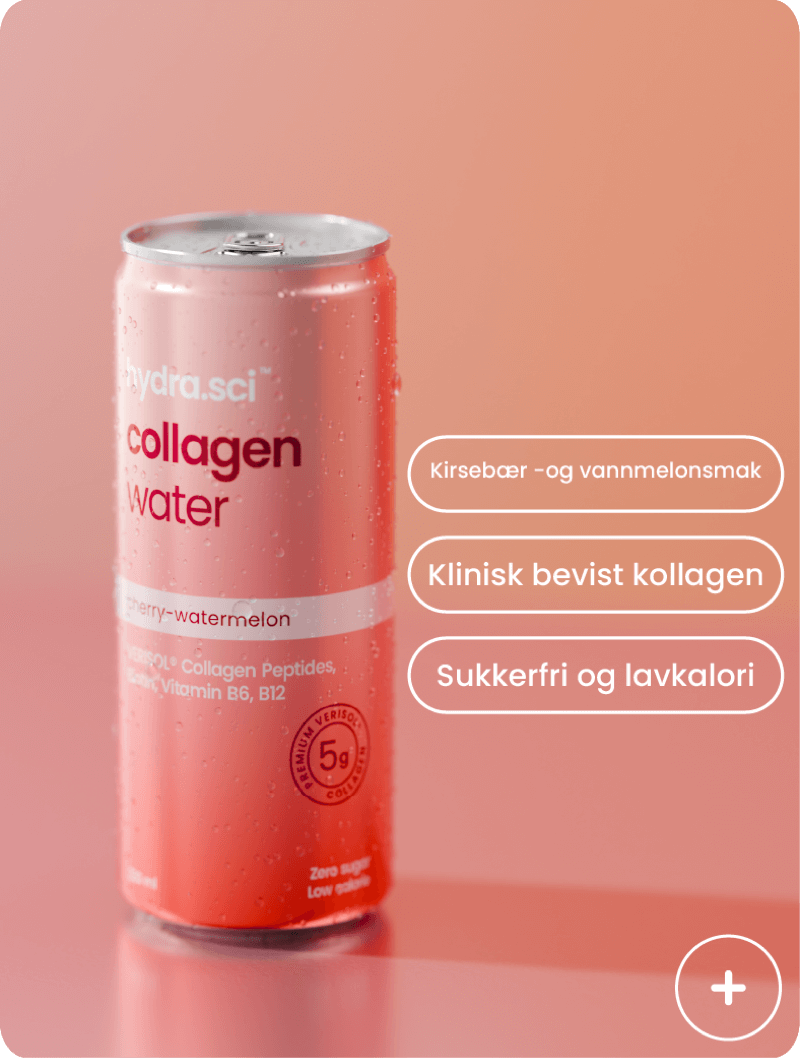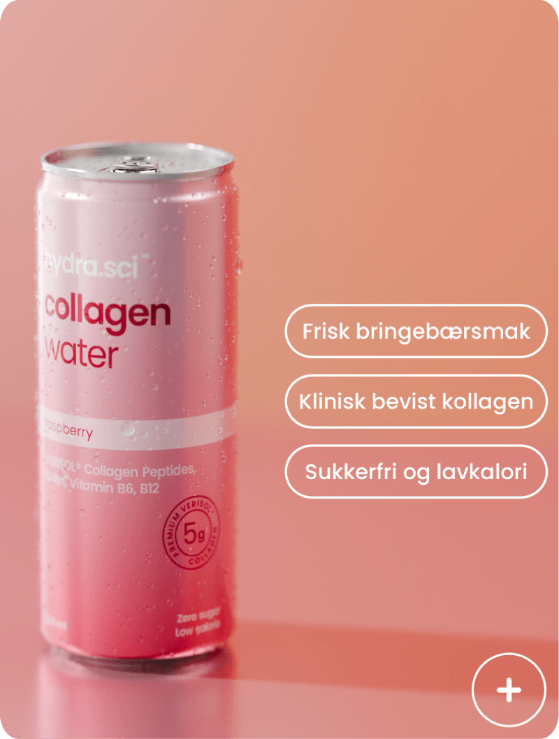 Hydra.Sci Collagen Water er en frisk kullsyredrikk med lettopptakelig kollagen som strammer opp huden, reduserer rynkedybden, og styrker hår og negler.